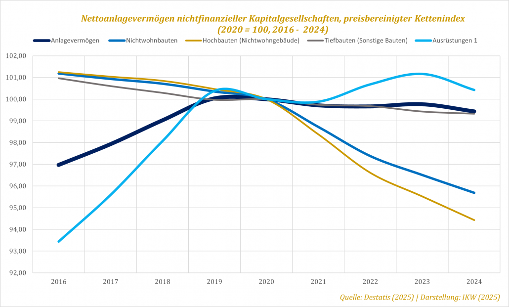 Die höhere Produktivität speist sich aus einem umfangreicheren Anlagenvermögen mit mehr Maschinen, Fabriken und stärkerer Digitalisierung, das allerdings seit 2019 stagniert: Es werden weniger oder gar keine neuen Fabriken gebaut, beim nichtwohnungswirtschaftlichen Bauen sinkt das Anlagenvermögen, und bei Ausrüstungen bewegt es sich seitwärts – genau wie das BIP.[7] Deutsche Unternehmen investieren real betrachtet nicht mehr: Die Bruttoinvestitionen sanken preisbereinigt von 910 Milliarden Euro im Jahr 2022 auf 855 Milliarden Euro im Jahr 2024,[8] ein Trend, der auch bei Mittelständlern zu beobachten ist.[9]